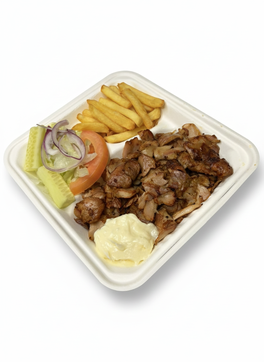 Piadina, pollo allo spiedo, patatine fritte, crema di aglio, insalata, pomodoro, cetrioli, cipolla
