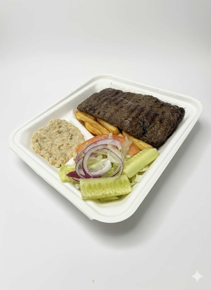 Piadina, kufta, patate fritte, insalata, pomodoro, cipolla, cetrioli, mutabal
